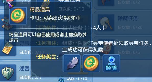 日程当中的寻宝任务也不要忘记,该任务也会有一定概率获得道具奖励,我们也可以通过出售此类道具获得梦想币。另外迷宫玩法中也有可能会获得梦想币,不过概率通常比较低。
