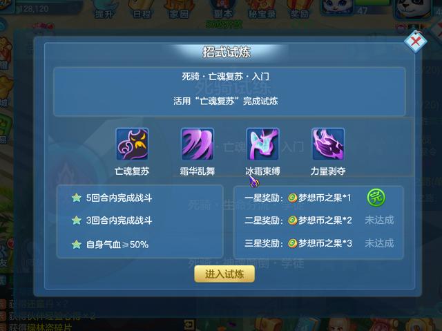 最后还有人物招式试炼,《梦想世界3D》中的招式试炼主要是为了让我们更加了解招式的运用,当然玩家们通过招式试炼后也可以获取梦想币。一种招式的试炼会分为3个星级,星级越高难度越大,当然可获得的奖励也会更好,待我们通过招式试炼后,即可获得"梦想币之果",随后我们只需使用它,就可以得到数量可观的梦想币了。