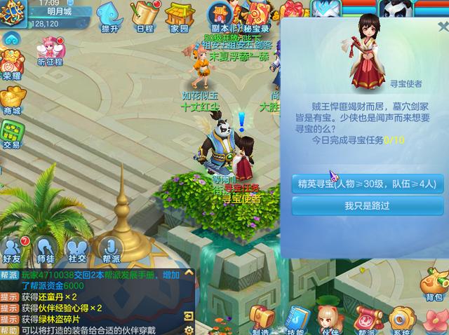 首先就是我们日程当中的宝图任务啦,这个任务可以说是每日必做,而宝图任务也是我们为获取梦想币所要完成的最简单的任务。宝图任务非常简单,玩家们可以在游戏界面上方的日程中找到它,或者也可以在明月城的游方道士处领取,任务开始后会我们的人物会自动完成这些任务,所以玩家们不必进行手动操作。宝图任务每天可以进行30次,任务完成后即可获得15张宝图,接着我们就可以使用这些藏宝图去挖宝了,而挖宝有一定概率会获得各种道具,这些道具一部分可以用来提升角色实力,或者我们也可以将其出售来换取梦想币。