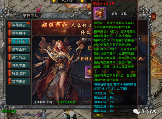 之前就有的一折礼包活动中现在更新了一个新的技能“阴阳神诀”,这个技能可以在被控制的时候使用,立即解除自身所有控制效果(包括麻痹、眩晕、沉默、冰冻、定身等等)并且在1秒内免疫所有控制,非常厉害的技能,等级提升之后免疫控制的持续时间还会增加。